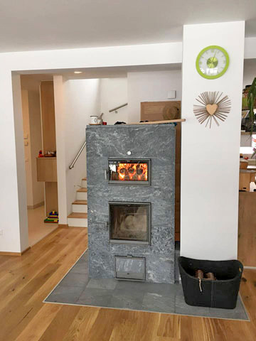 Eine gute Übersicht der unterschiedlichen Ofenlinien finden Sie in unserem Österreichkatalog, hier sind die drei gesetzten Speichervarianten Karelia, TLU-Backfachöfen und Klassik-Öfen. Die Karelia-Serie kann auch als Speicherofen-Tunnelversion – also mit zwei gegenüberliegenden Sichtfenstern gebaut werden – während bei Backrohröfen das Backrohr um 180 Grad gedreht werden kann, sodass z.B. im Wohnzimmer das untere Sichtfenster zu sehen ist, auf der Küchenseite das Backrohr. Möchte aber darauf hinweisen, dass durch die milde Oberflächentemperatur sehr oft eine Sitzbank direkt beim Ofen mit eingebunden wird: